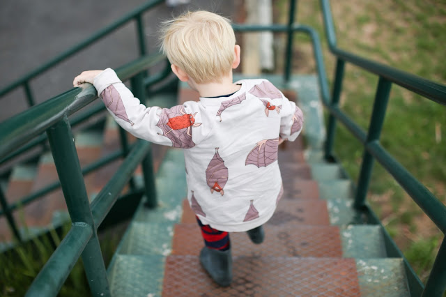 This boy is growing up so quickly, he is beautifully confident and loves to engage with people, to have a chat, and his imaginative play is developing into something quite lovely. When we climbed up the steps in the photograph above, Elroy was imagining us climbing onto a plane, it was very very cute! Also talking about cute, how gorgeous is his Mini Rodini bat jumper and stripe leggings from Frankie's Story, he loves this jumper so much.